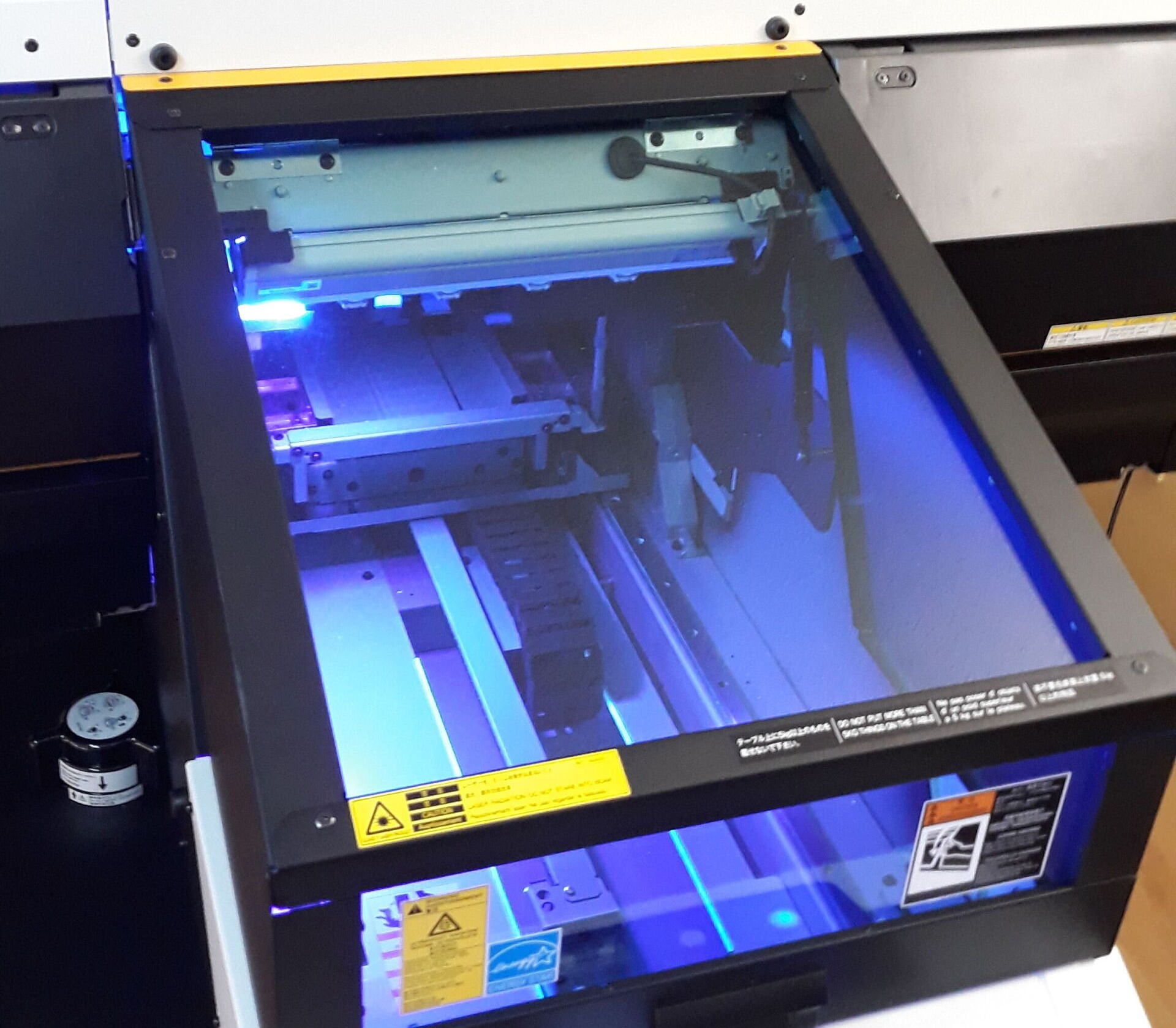 Die Tinte liegt auf der jeweiligen Oberfläche auf und härtet bei Bestrahlung mit ultraviolettem Licht sofort aus. Als Ergebnis erhalten Sie also einen Farbfilm auf dem bedruckten Material. Die dazu verwendete UV-reaktive Tinte enthält keine Lösungsmittel und ist somit umweltschonender.